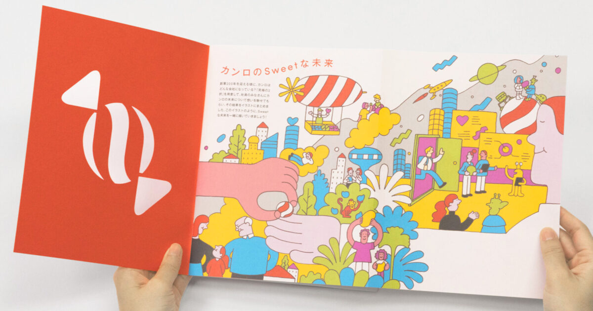 表紙を開いてすぐのページは当初、中計の内容やカンロが取り組むSDGsをビジュアル化する案を考えていたのですが、「もっと夢がある、みんながワクワクするようなものがいい」とのご要望を受けて、思いきって趣向を変更しています。最終的に、「創業200年を迎えるころに、カンロはどんな会社になっているか?」というテーマで社員の方々にアンケートを実施して、その結果をもとに「カンロのSweetな未来」というイラストを制作しました。