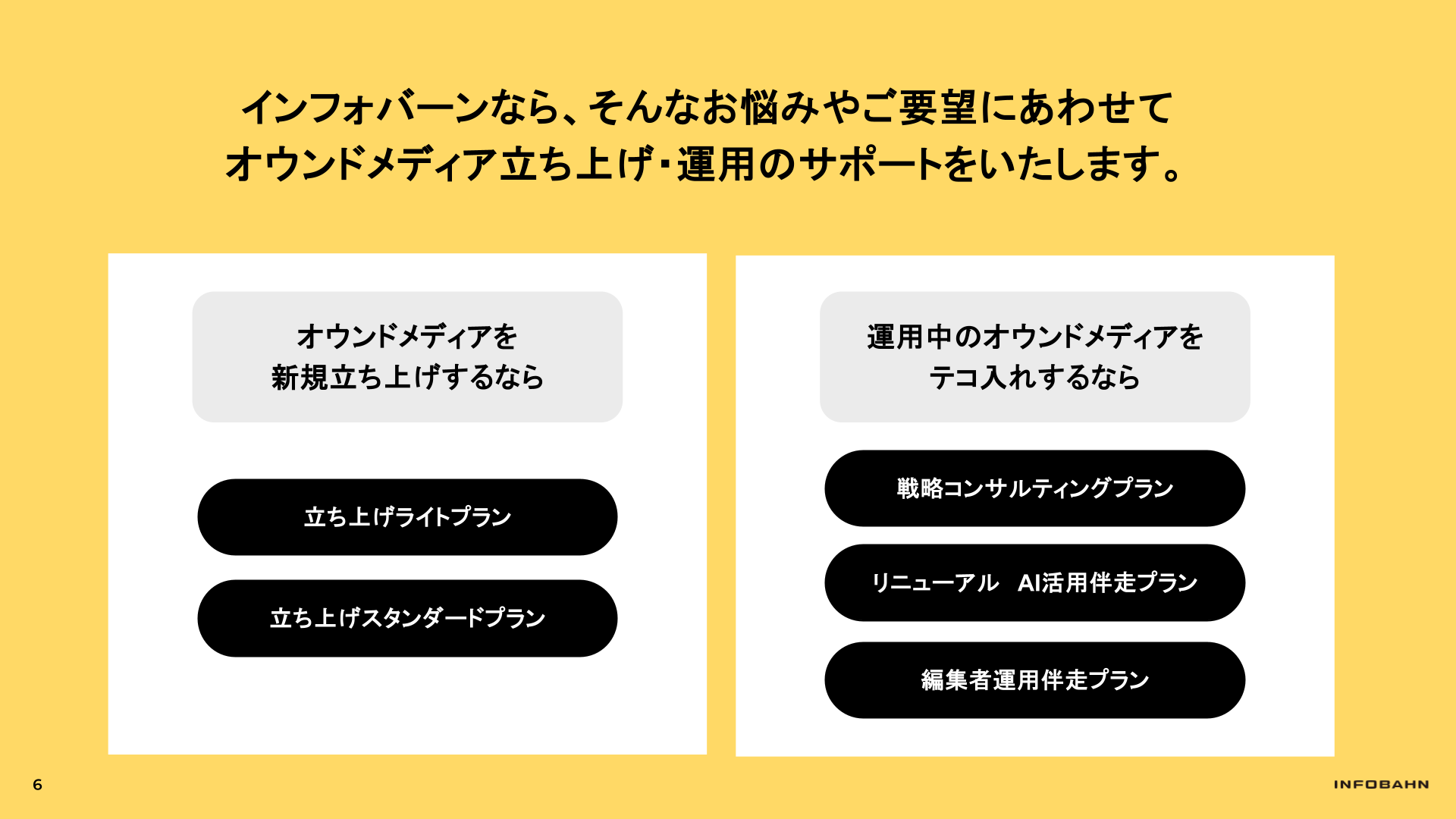 100社以上のオウンドメディア支援実績を持つインフォバーンが、貴社の予算やフェーズに合わせた最適な立ち上げ・運用支援プランをご紹介します。