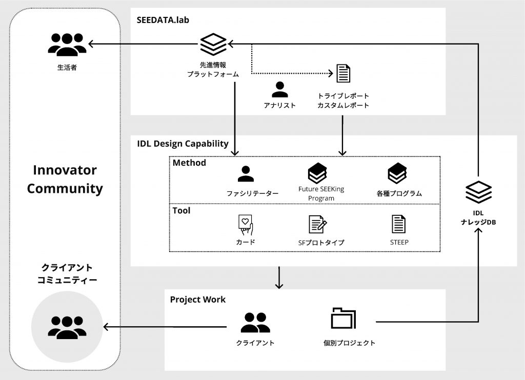 IDLはSD/Gと連携し、さまざまな組織やチームの事業開発プロジェクトを遂行するために、SD/Gが提供するTRIBEレポートを始めとした各種データを有効活用するためのプログラム(Future SEEKing Program)に加えて、その他各種ツールやメソッドを開発していきます。実践によって得られた我々自身の知見を併せて提供・共有することで、イノベーターコミュニティの発展に寄与します。