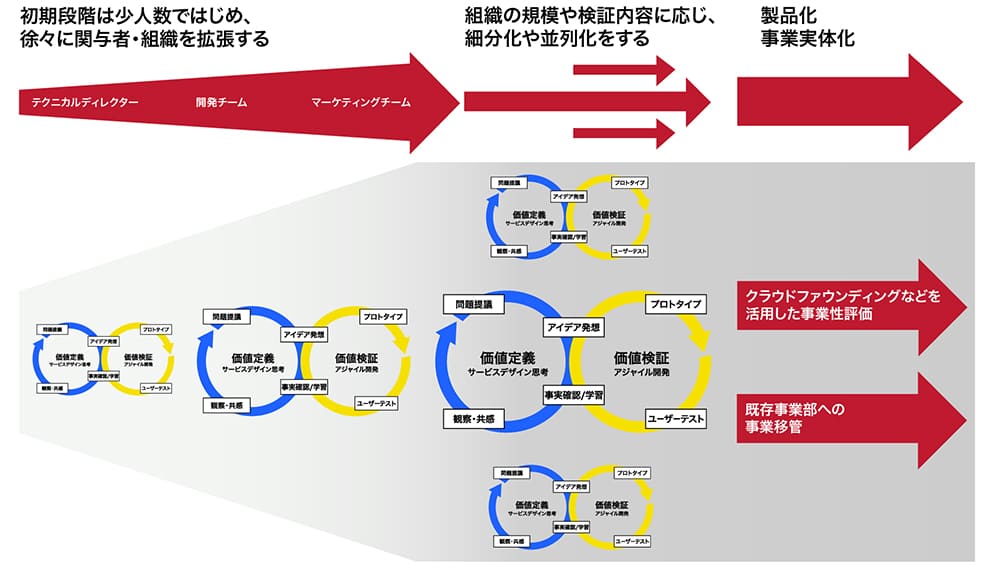 - コンセプトレベルでの具体化と検証で留まってしまい、実稼働レベルの製品プロトタイプによる検証までたどり着かないため、実開発フェーズまで進められない。