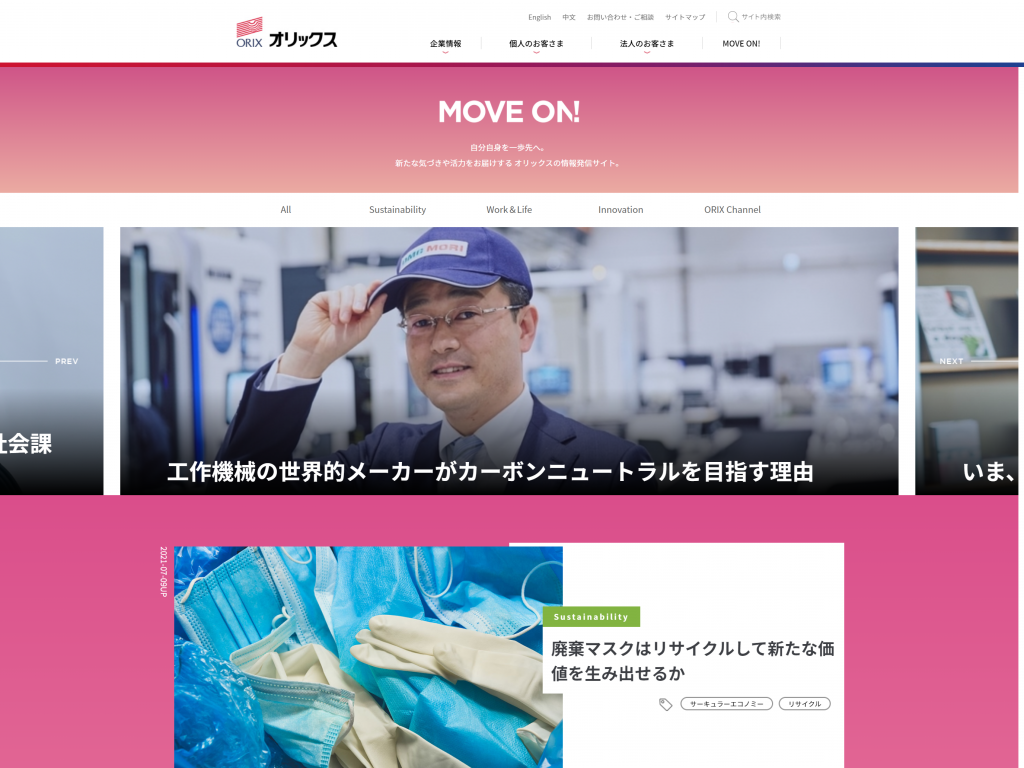 オリックス株式会社のコーポレートサイト内では、オウンドメディア「MOVE ON!」が広報ご担当者さまによって運営されており、その中のオリジナルコンテンツ制作をインフォバーンに依頼いただいております。20代~30代のビジネスパーソンの関心事やその社会的背景・文脈に、事業内容を組み合わせたコンテンツを発信することで、企業の提供価値が伝わることを目指しています。